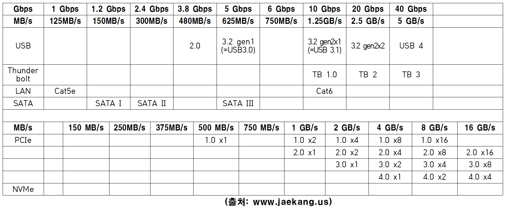 여기서 한 가지 혼동하지 말것은, Mbps라는 단위와 MB/s이라는 단위이다. bps는 bits per second로 초당 비트 수를 말한다. 이것은 원래 통신 속도의 단위로 1초 간에 송수신할 수 있는 비트 수를 표시하는 목적이다. 반면에, b/s는 byte per second로 초당 바이트의 수를 말한다. 1 Byte/s = 8 bps이기 때문에 bps를 8로 나누어야 B/s단위로 환산이 된다.