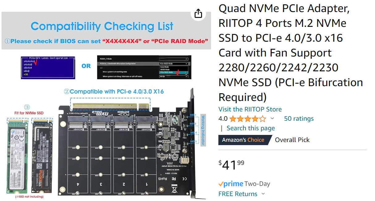 그러나 문제는 내 PC의 메인보드에 NVMe를 장착하는 M2 슬롯이 없을 때이다. 간혹 형태는 M2 슬롯이지만 실제로는 SSD 속도와 같은 SATA 6용인 경우가 있으니까 자신의 메인보드 매뉴얼을 확인해보아야 한다. 이런 경우 PCIe 슬롯에 장착해서 사용할 수 있는 확장 카드가 있다. NVMe Bifurcation Card라고 한다. NVMe를 1개에서 4개까지 끼울 수 있다. 이런 분할 카드를 사용하려면 먼저 메인 보드 bios에서 분할(bifurcation)을 지원하는지 확인이 필요하다.